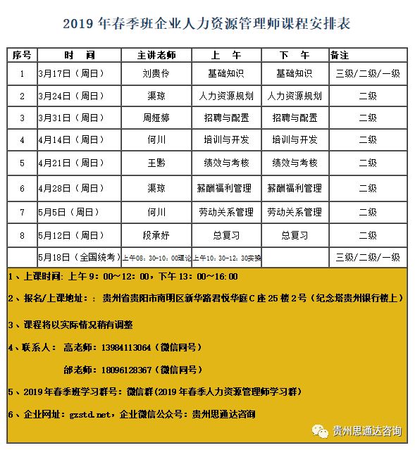 贵州思通达管理咨询有限公司是一家具有独立法人资质的企业。是以教育、培训、企业管理咨询、外包服务为主的管理咨询机构。 我司秉承资源共享、合作共赢的经营理念。邀请到全国知名企业管理人才及各行业精英人才组成了强大的任教及咨询团队,我们始终专注于领域内专业知识的探究,力争为合作伙伴创造可持续的价值。 目前开设教育类项目有:学历提升自考专科/本科/在职研究生、网络教育高起专/专升本。 培训类项目有: 职业资格《国家心理咨询师》、《企业人力资源管理师》、《企业培训师》、《理财规划师》、《电子商务师》、《职业指导人员》、《信用管理师》、《社会工作者》、《育婴师》、《健康管理师》、《养老护理员》、《初级会计师》、《中级会计师》。 实操带训《会计精品实训》、《TTM培训培训管理者》、《心理咨询督导实训》。 企业内训《TTT》、《非人力资源资源经理的人力资源管理培训》、《非财务经理的财务管理培训》。 咨询项目《心理个案咨询》、《心理团队辅导》、《企业EAP-员工心理援助计划》。 外包项目《企业招聘》、《人才推荐》。 公司秉承资源共享,合作共赢的经营理念,欢迎您加入到我们的共享的大家庭! 人力资源管理师(Human Resources Professional,HRP)指从事人力资源规划、招聘与配置、培训与开发、绩效管理、薪酬福利管理、劳动关系管理等工作的管理人员。国家自2003年开始,规定从业人员必须持证上岗。 目前人资管理专业的就业方向主要有三个。第一是面向企业,这将是主要方向。第二是公共事业单位,如政府机关、各种社会群体和组织。第三类是科研教学机构。据调查,人力资源管理专业人员就职企业普遍分布于各行各业。在“亚洲最紧缺的30种人才”调查中,人力资源专业也位居其中,可见人力资源管理师就业前景非常乐观。 (排名不分先后) 渠琼老师:国家高级人力资源管理师,人力资源管理培训讲师。曾担任北京城建、北京勰睿基业、贵州保恒集团中高级管理人员,熟悉组织体系架构建设、招聘、企业薪酬福利、绩效考核相关流程和制度的建立及执行。具备丰富的人力资源管理专业知识和实际操作经验。 刘贵伶老师:国家高级人力资源管理师,曾就职于广州某媒体广告公司人力资源部经理,广州家乐福人力资源部经理,现就职于某房产集团公司人力资源部经理;较擅长人力资源规划、薪酬管理体系建立,具有丰富的现代人力资源、战略人力资源管理理论知识和实践经验。 王黔老师:国家高级人力资源管理师;国家中级职业经理人;企业人力资源管理师培训讲师。多年人力资源管理实战,涉足医药、能源行业、快消品行业,对人力资源体系建设、团队搭建有独特见解。曾任职于大型民营企业、国营企业人力资源部等。擅长课程有绩效管理实战、高效沟通、职业素养修炼等。 何川老师:国家二级心理咨询师;国际职业训练协会(IPTA)认证TTT培训师;国家执业药师;从事教育行业多年,现任世界500强企业人力资源部副经理。 段承妤老师: 毕业于西南政法大学。二级企业人力资源管理师,国家三级心理咨询师,曾就职于某连锁集团服饰公司劳动关系主管、某新加坡上市集团公司贵州分公司人力资源部经理,现就职于某投资控股集团有限公司人力资源总监。对于培训管理及劳动关系管理有比较丰富的实践经验。 周娅婷老师:服装零售企业人力资源总监;国家高级人力资源管理师;TTT认证培训师;DISC认证讲师及授证顾问;DISC社群推荐讲师;五维教练领导力认证讲师;4D系统认证导师;4D背景转换认证教练。 人力三级(初级):年龄(18周岁及以上) 学历(大专及以上) 人力二级(中级):年龄(26周岁及以上 ) 学历(大专及以上) 人力一级(高级):年龄(30周岁及以上) 学历(大专及以上) 报名时间:即日起至4月10日 现场报名地点:贵州省贵阳市南明区新华路君悦华庭C座25楼2号(也可以电话/微信报名,报名方式见页尾) 上半年考试时间:5月18日 扫一扫添加以下任一老师微信或QQ;添加成功后,发送“我要报考人力x级”至所加老师即可。 Tel:13984113064 Tel:18096128367更多课讯,请关注以下公众号